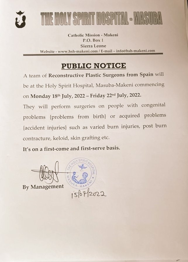 “A team of Reconstructive Plastic Surgeons from Spain will be at the Holy Spirit Hospital, Masuba-Makeni commencing on Monday 18th July, 2022 – Friday 22nd July, 2022,” the notice states.