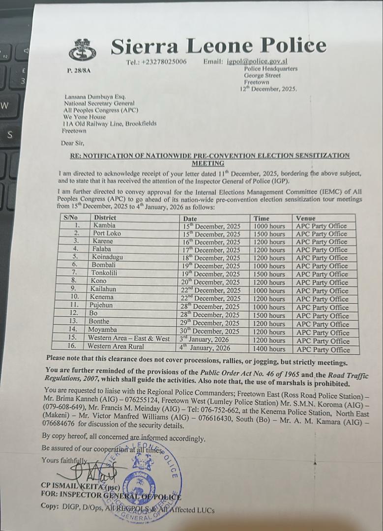 The SierraLeone Police has approved a nationwide pre-convention election sensitisation tour by the opposition All Peoples Congress (APC).