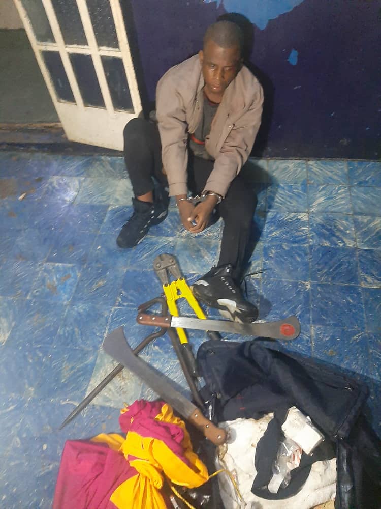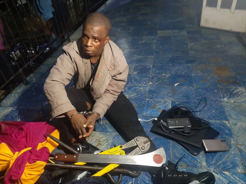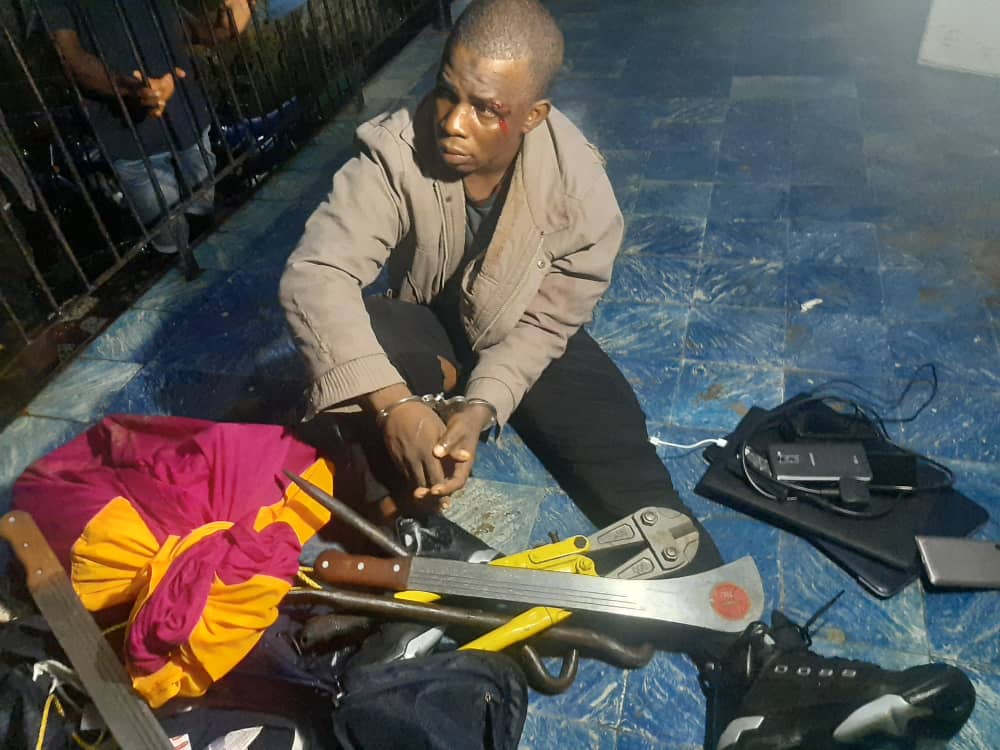 The Congo Cross Police Division has on the early morning hours of today, 28 August 2022 arrested a armed robber in possession of giant cutter, two crowbars, two cutlass, five phones, two laptop and a bag. The properties belong to two American citizens residing at a guest house in Mudge Farm.