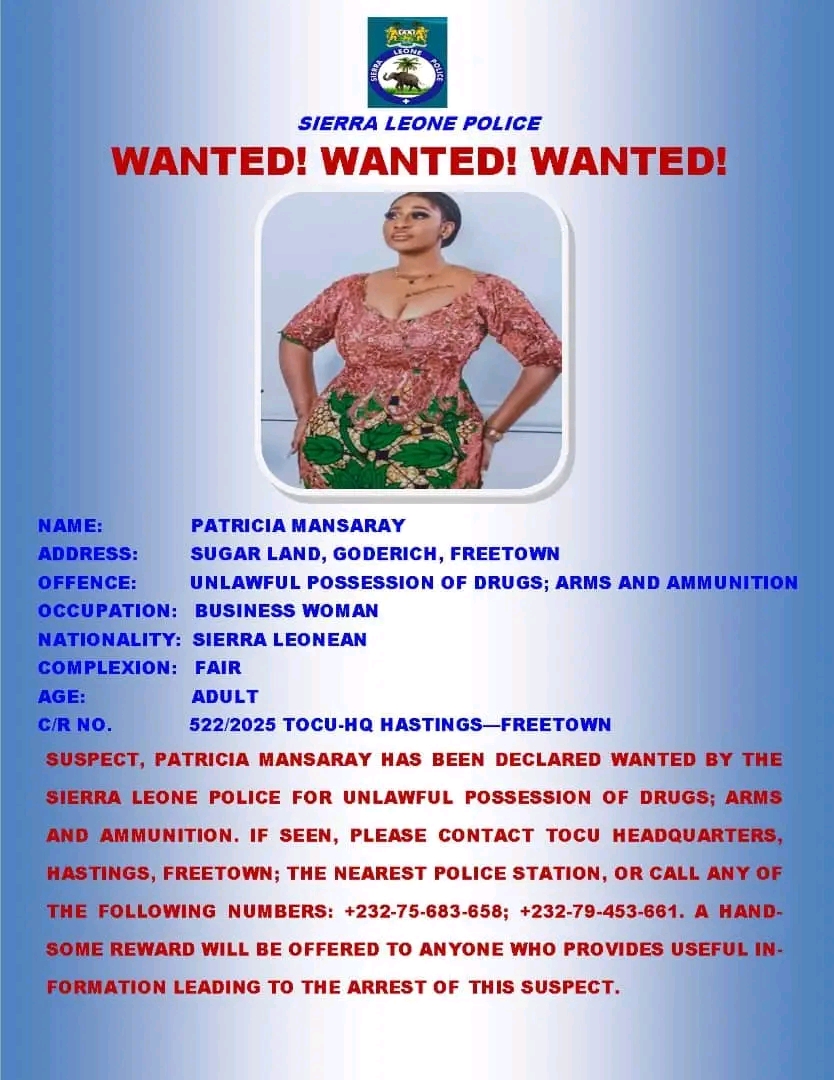 The Sierra Leone Police (SLP) have officially declared Patricia Mansaray a wanted fugitive following the discovery of a substantial cache of suspected narcotic drugs, along with arms and ammunition, at her residence in the Goderich area of Freetown.