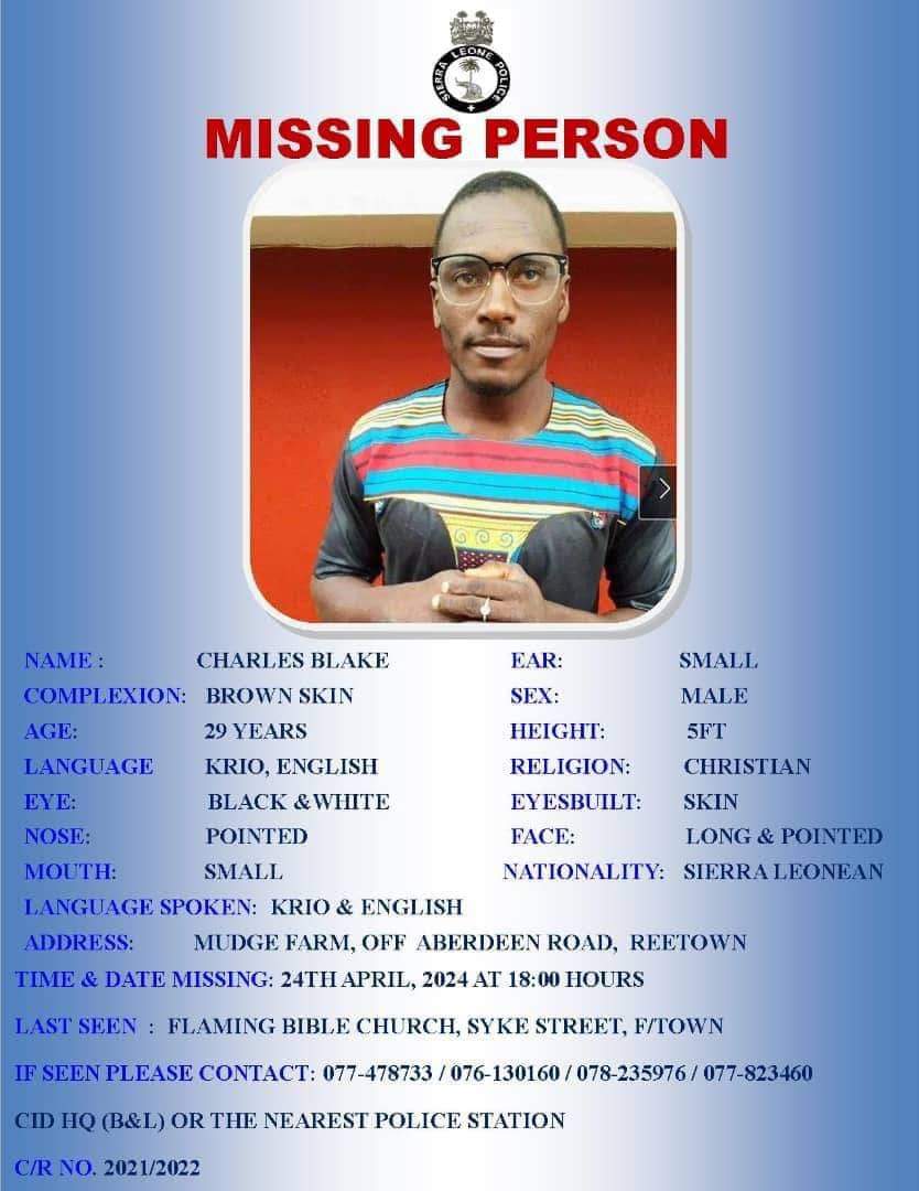 The report stated that, Charles Blake was staying at Mudge Farm, Off Aberdeen Road Freetown and was last seen at the flaming bible church, Syke Street.
