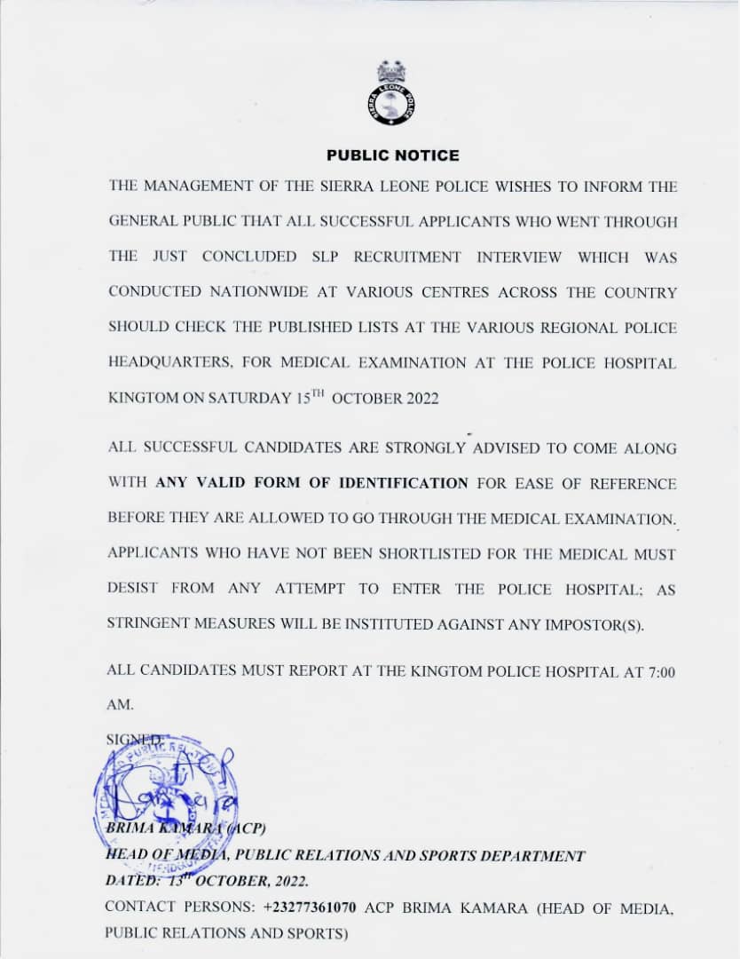 “The management of the Sierra Leone Police wishes to inform the general public that all successful applicants who went through the just concluded SLP recruitment interview which was conducted nationwide at various centres across the country should check the published lists at the various regional Police Headquarters, for medical examination at the Police Hospital Kingtom on Saturday 15th October 2022.