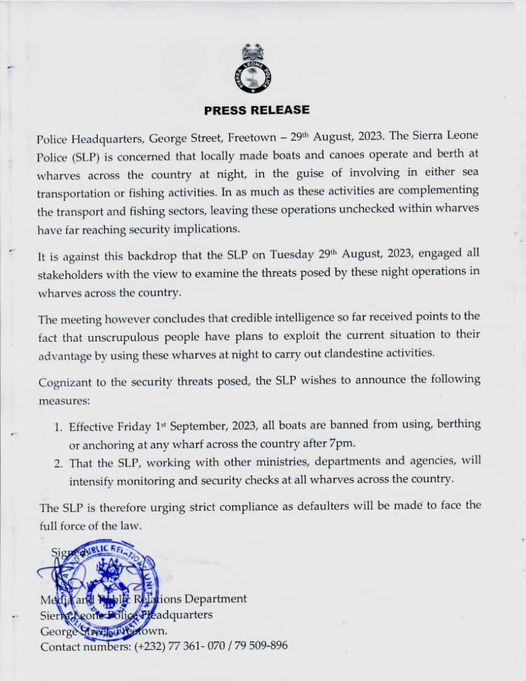 The release reads; Police Headquarters, George Street, Freetown – 29th August, 2023. The Sierra Leone Police (SLP) is concerned that locally made boats and canoes operate and berth at wharves across the country at night, in the guise of involving in either sea transportation or fishing activities. In as much as these activities are complementing the transport and fishing sectors, leaving these operations unchecked within wharves have far reaching security implications.