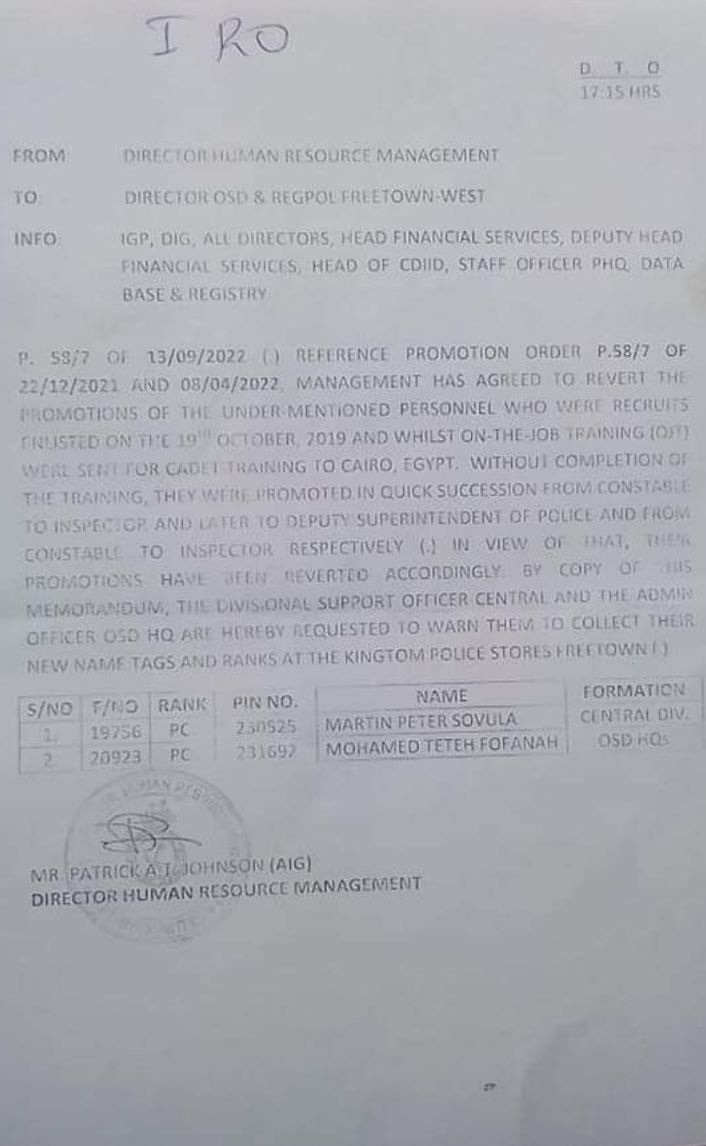 In that light, these officers have been demoted and have asked them to collect their new names tags and ranks at the Kingtom police store in Freetown.