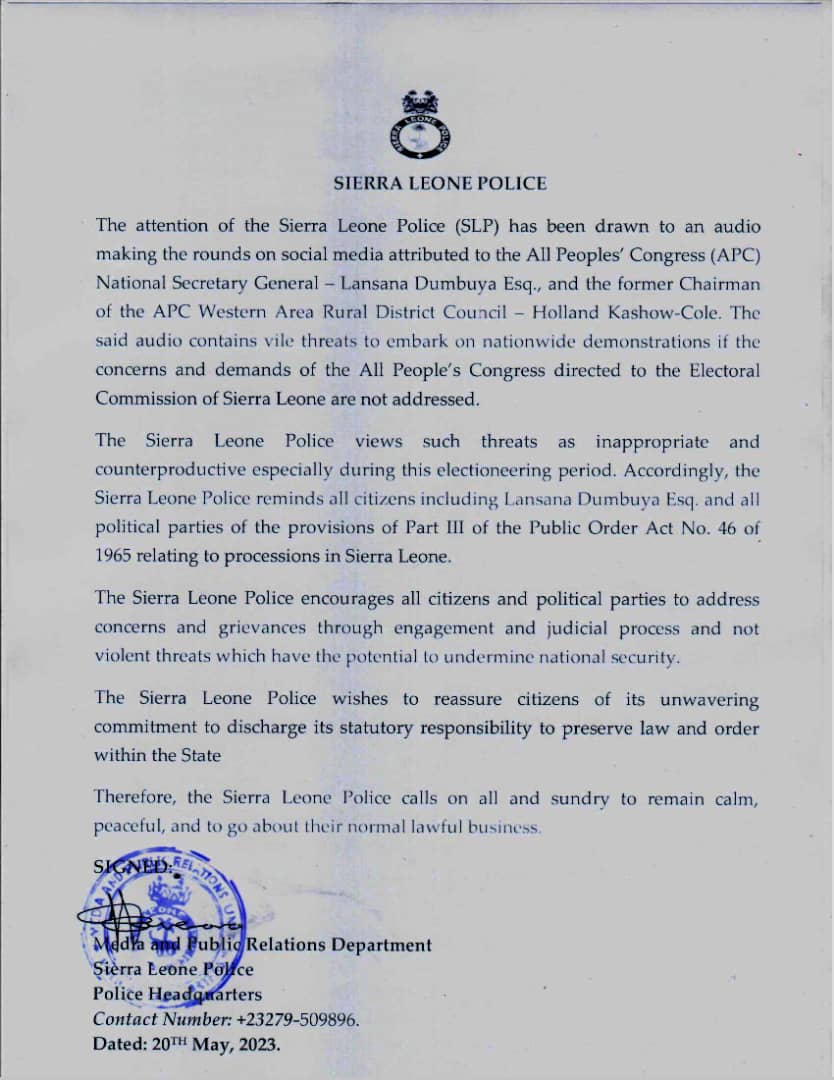 On Saturday, May 20, 2023, the Sierra Leone Police in a press release responded to an alleged audio recording attributed to the main opposition APC party. The recording reportedly contains threatening remarks, indicating the possibility of nationwide demonstrations if the Electoral Commission of Sierra Leone does not address the concerns and demands put forward by the All People’s Congress Party.