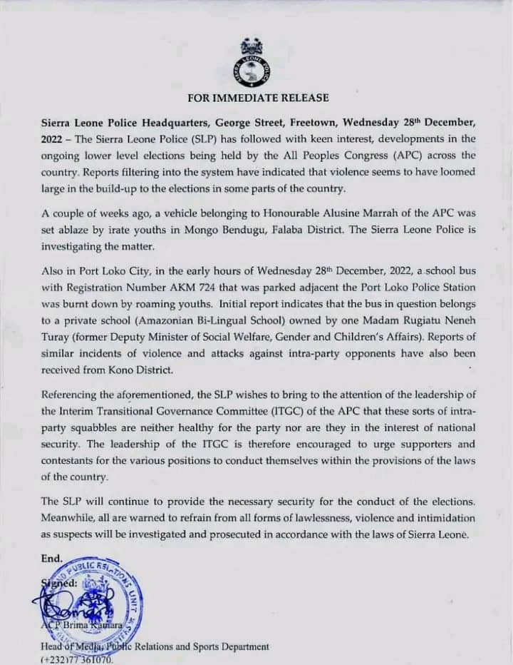 “The Sierra Leone Police (SLP) has followed with keen interest, developments in the ongoing lower level elections being held by the All Peoples Congress (APC) across the country. Reports filtering into the system have indicated that violence seems to have loomed large in the build-up to the elections in some parts of the country,” the Police stated.