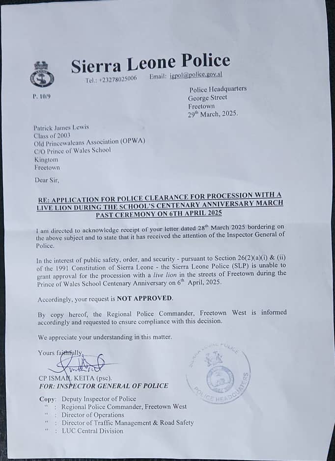 A bold attempt by the Class of 2003 of the Prince of Wales School (POW) to feature a live lion in their school’s centenary anniversary march past has been denied by the Sierra Leone Police.