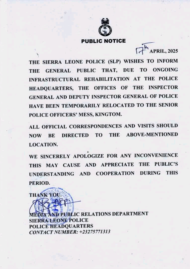 The Sierra Leone Police (SLP) has announced that the offices of the Inspector General and Deputy Inspector General have been temporarily moved to the Senior Police Officers’ Mess in Kingtom, Freetown, due to ongoing renovations at the police headquarters.