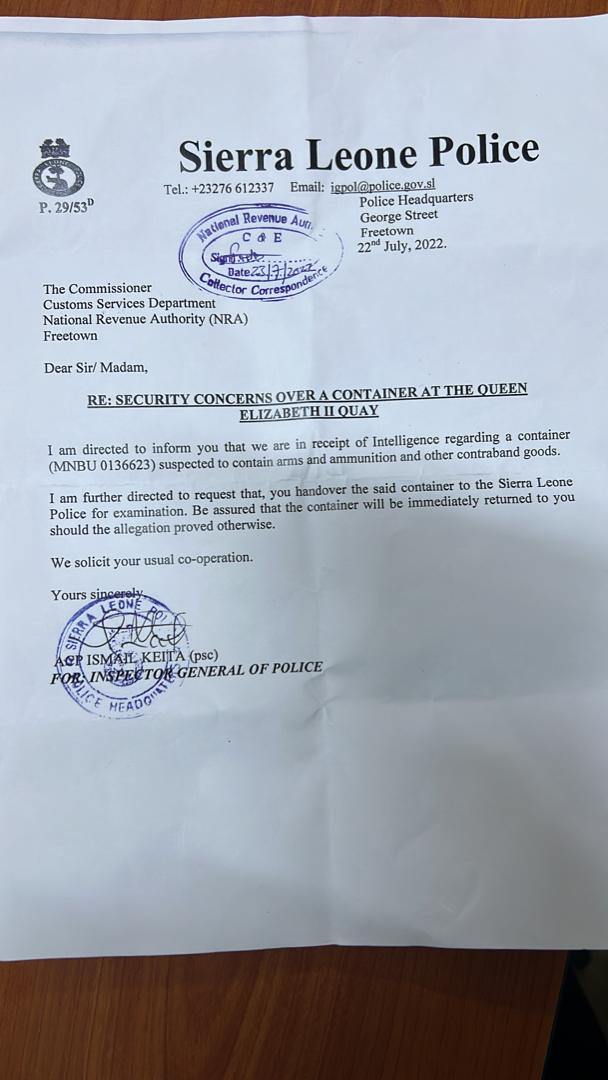 The Sierra Leone Police (SLP), has requested to the Commissioner of the National Revenue Authority (NRA) to hand over the said container to them for examination.