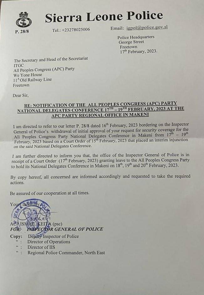 The Police’s decision came after the court lifted the interim injunction on the NDC of the APC which was scheduled for the 17th to 19th of February 2023 in Makeni Northern Sierra Leone.
