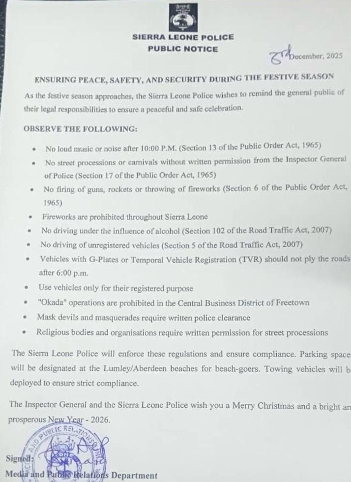 The notice concluded with seasonal greetings from the Inspector General and the Sierra Leone Police, wishing citizens a Merry Christmas and a prosperous New Year 2026.