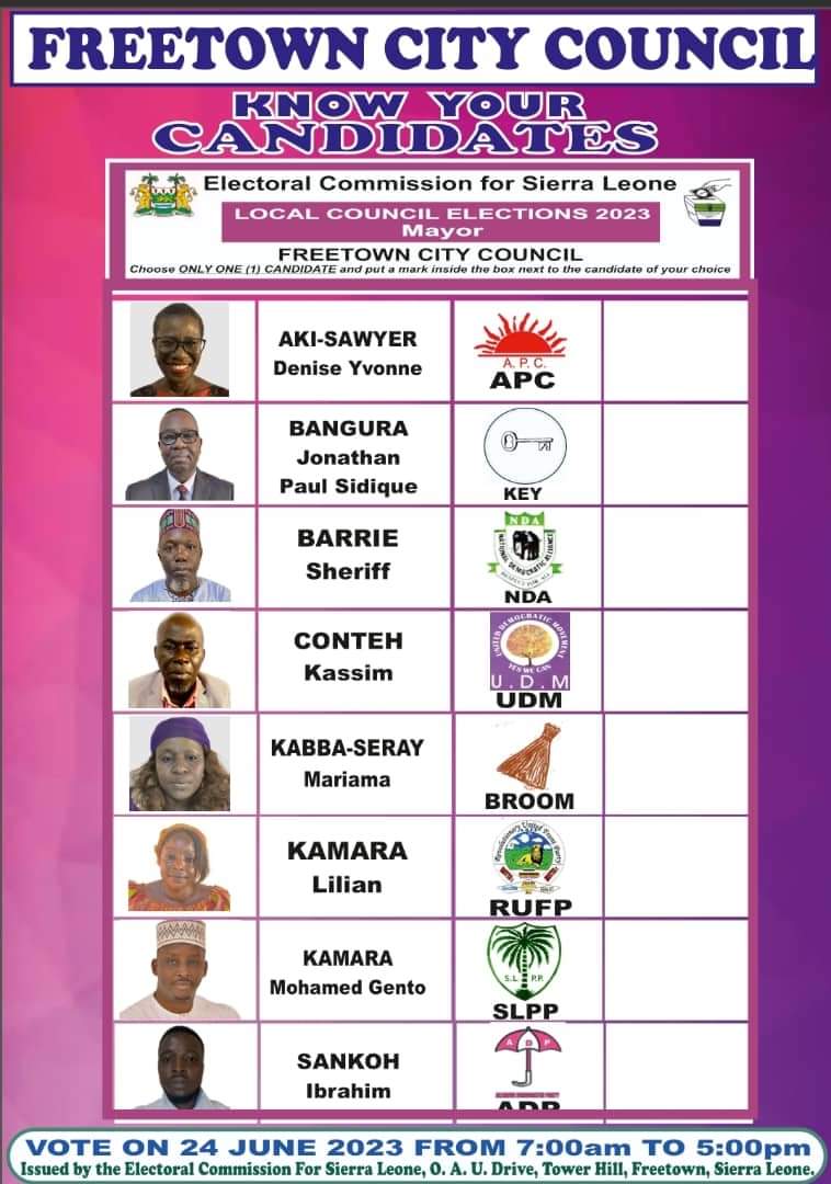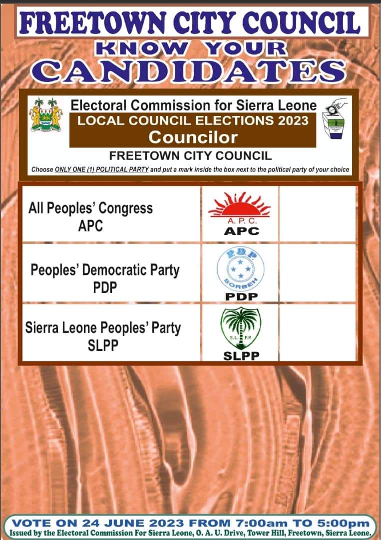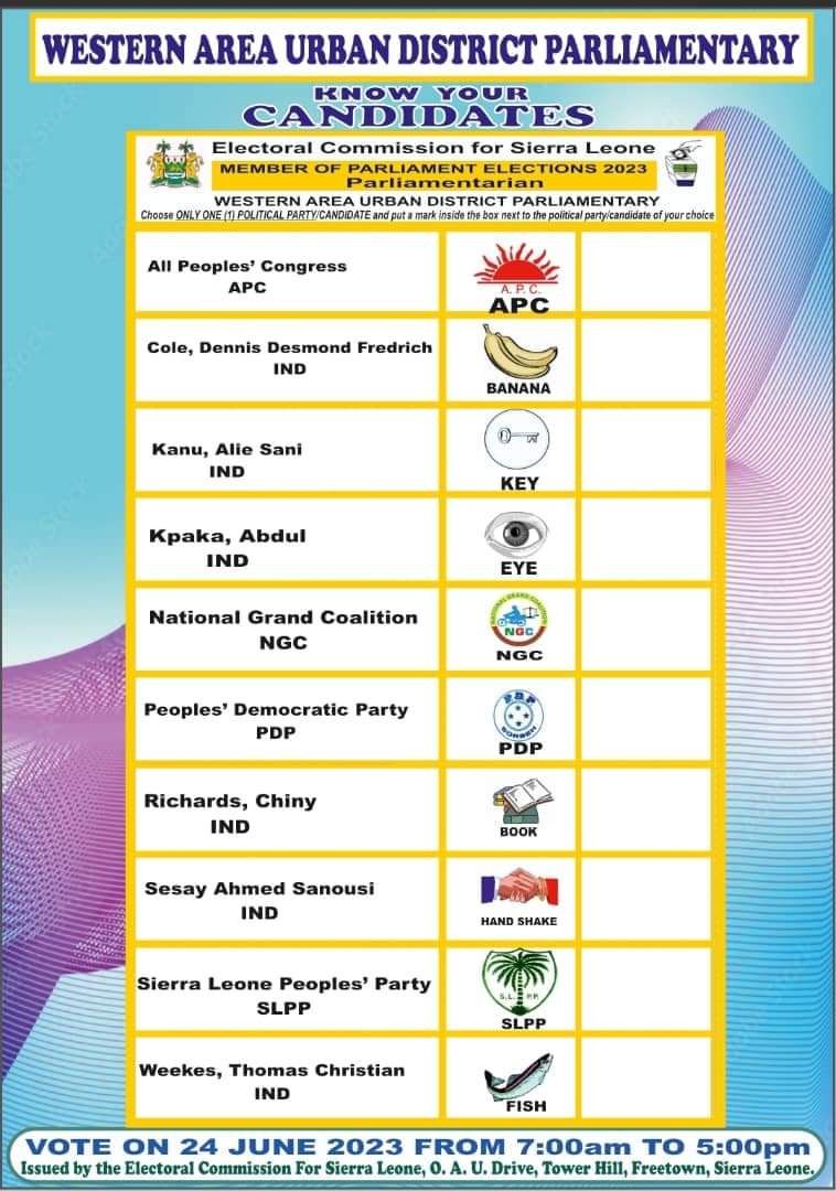 In preparation for the highly anticipated Sierra Leone multi-tier elections scheduled for June 24th, 2023, the Electoral Commission for Sierra Leone (ECSL) have revealed the list of political candidates for the Western Area Urban district.