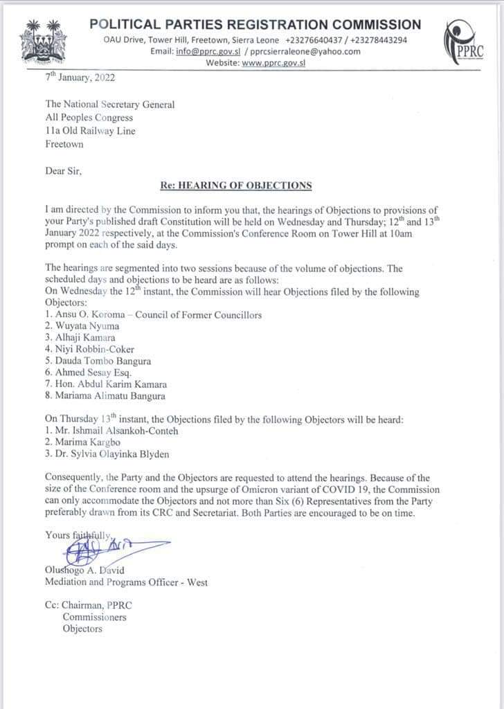 The Political Party Registration Commission (PPRC) has announced date for the hearing of the objections of the new APC Constitution.