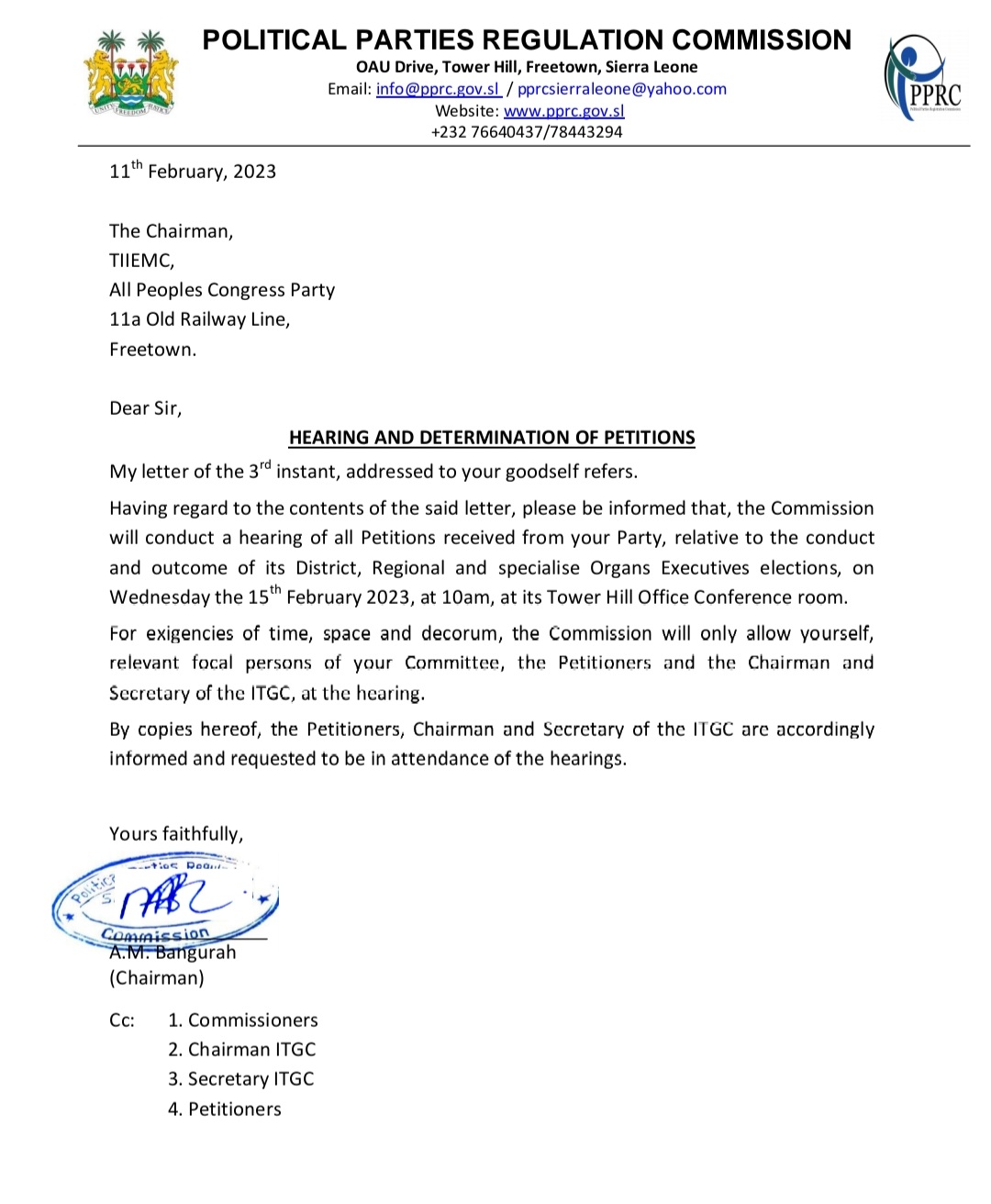 The Political Parties Registration of Sierra Leone (PPRC) has announced that they will conduct a hearing on all petitions received from the All People’s Congress (APC) party, relative to the conduct and outcome of its District, Regional and specialise Organs Executives elections, on Wednesday the 15th February 2023.