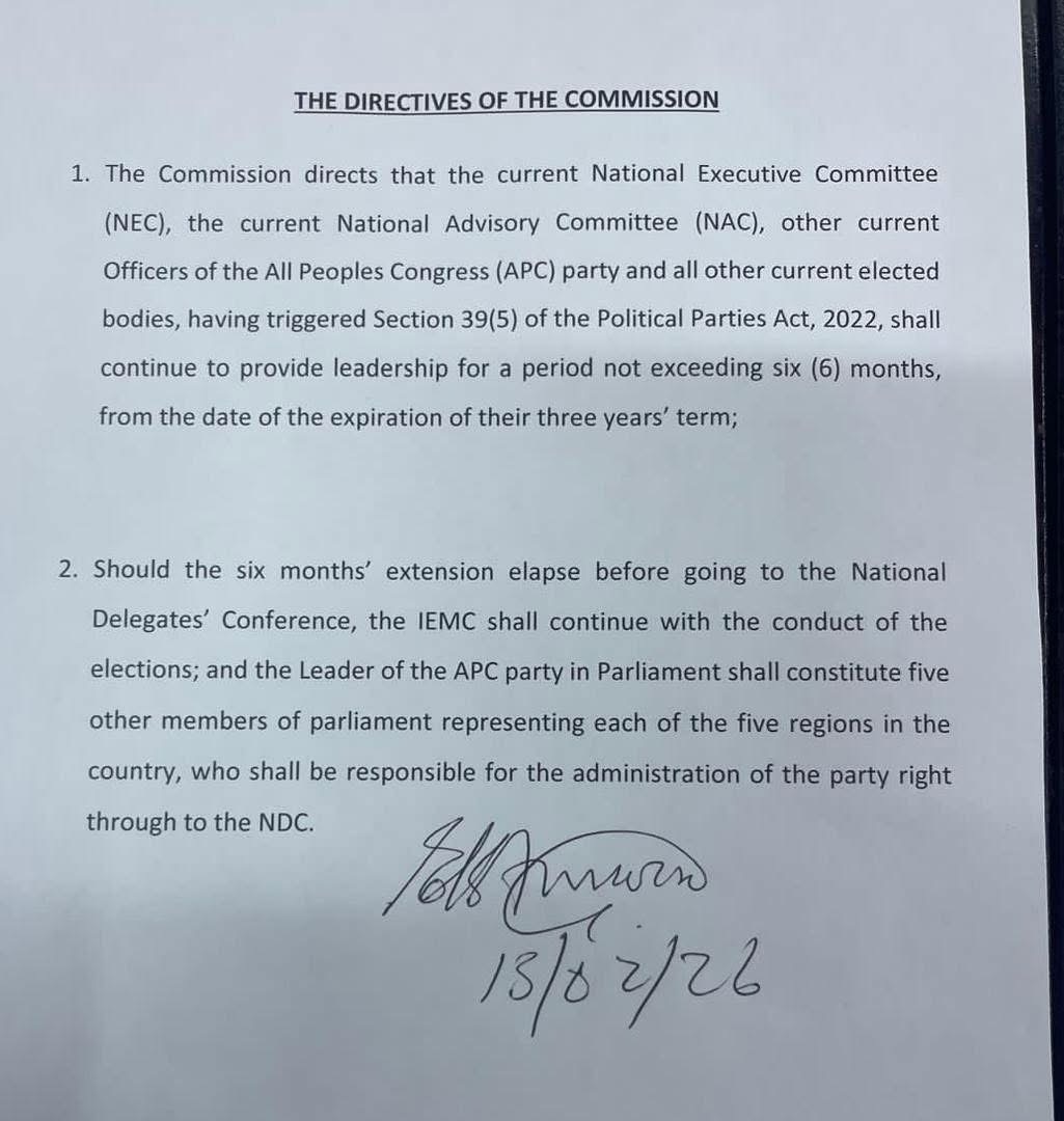 In a directive titled “The Directives of the Commission,” the PPRC stated that the current NEC, NAC, other current officers of the APC and all other current elected bodies, “having triggered Section 39(5) of the Political Parties Act, 2022, shall continue to provide leadership for a period not exceeding six (6) months, from the date of the expiration of their three years’ term.”