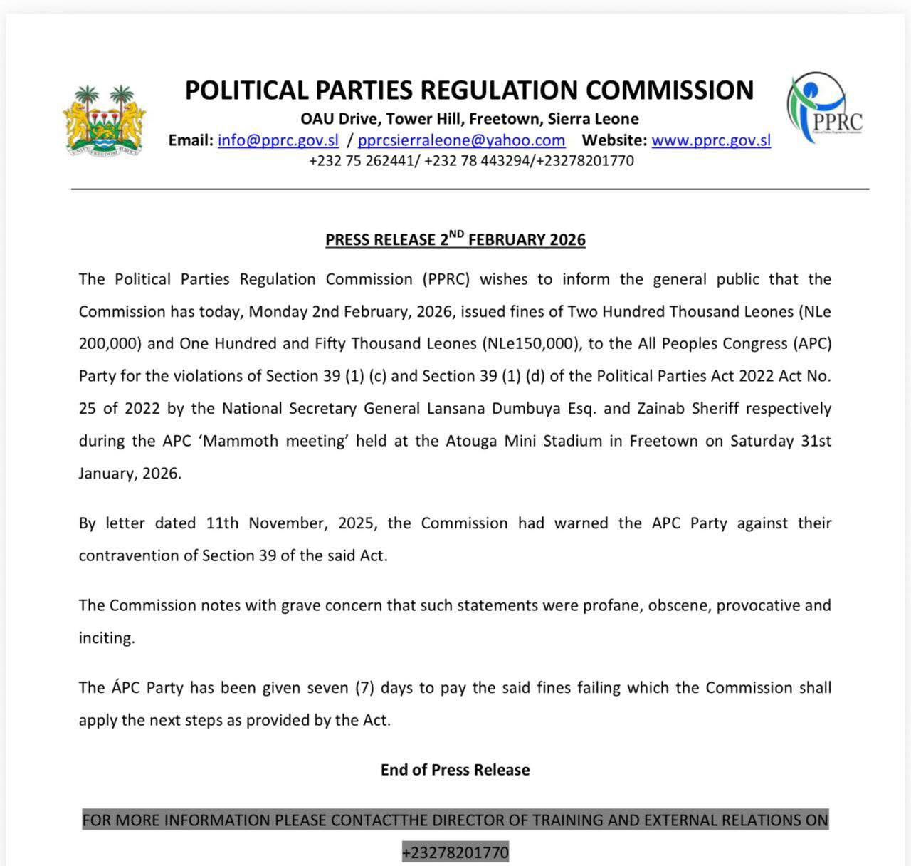 In a press release dated Monday, 2 February 2026, the PPRC informed the general public that it had imposed fines of two hundred thousand Leones (NLe200,000) and one hundred and fifty thousand Leones (NLe150,000) on the APC. The fines relate to violations of Section 39 (1)(c) and Section 39 (1)(d) of the Political Parties Act, 2022 (Act No. 25 of 2022).