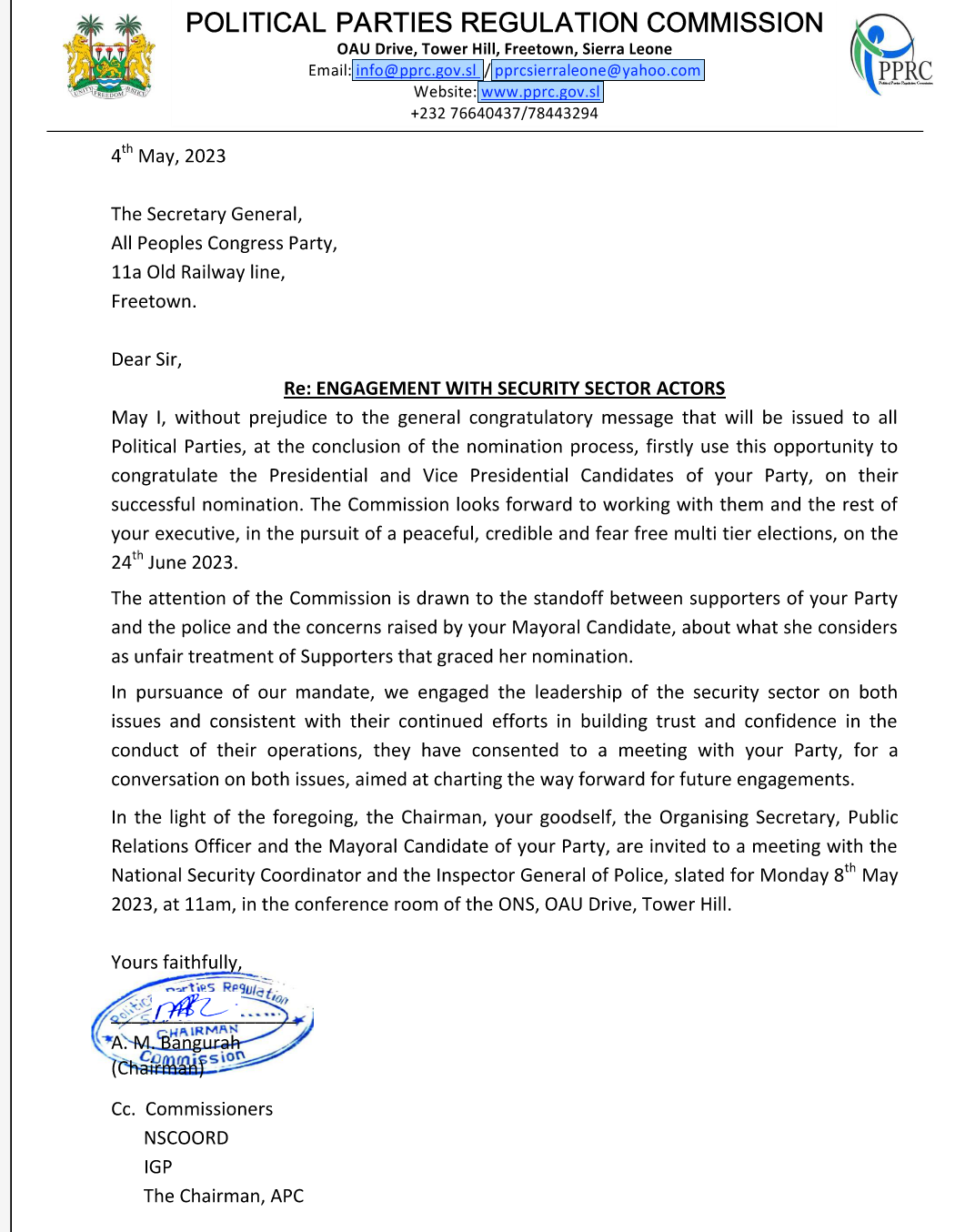 In the light of the foregoing, the Chairman, your goodself, the Organising Secretary, Public Relations Officer and the Mayoral Candidate of your Party, are invited to a meeting with the National Security Coordinator and the Inspector General of Police, slated for Monday 8th May 2023, at 11am, in the conference room of the ONS, OAU Drive, Tower Hill”.