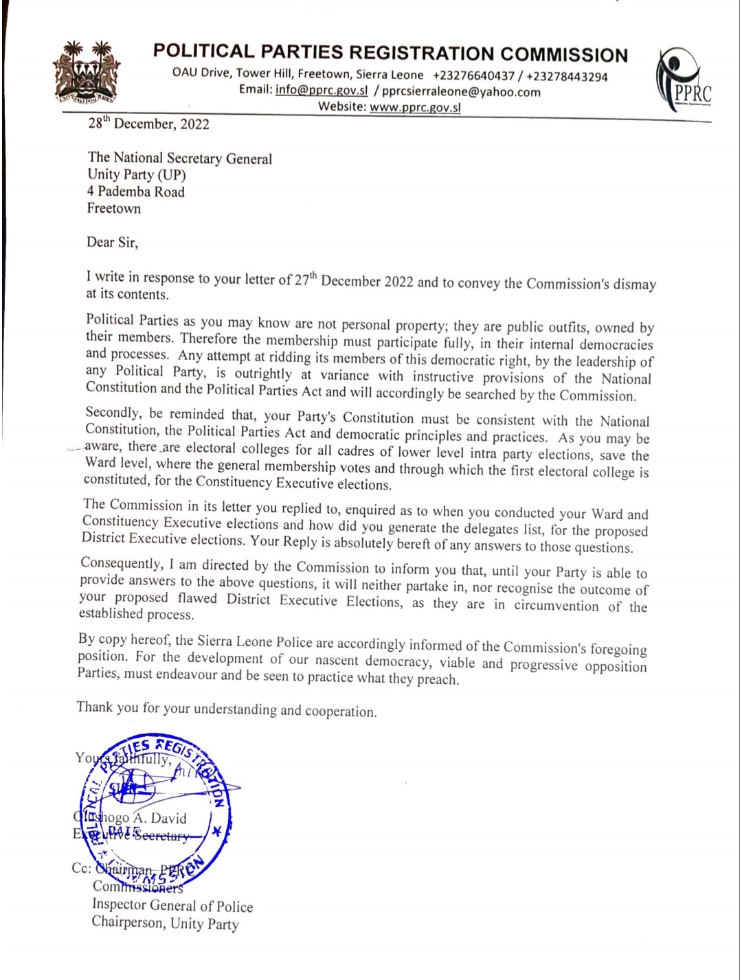 PPRC gave this warning in a letter written to the National Secretary Genera of Unity Party on Wednesday 28 December 2022.