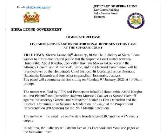 The Judiciary of Sierra Leone has issued a public notice for the commencement of a Supreme Court hearing on the matter of the Proportional Representation (PR) system for the 2023 General Election.