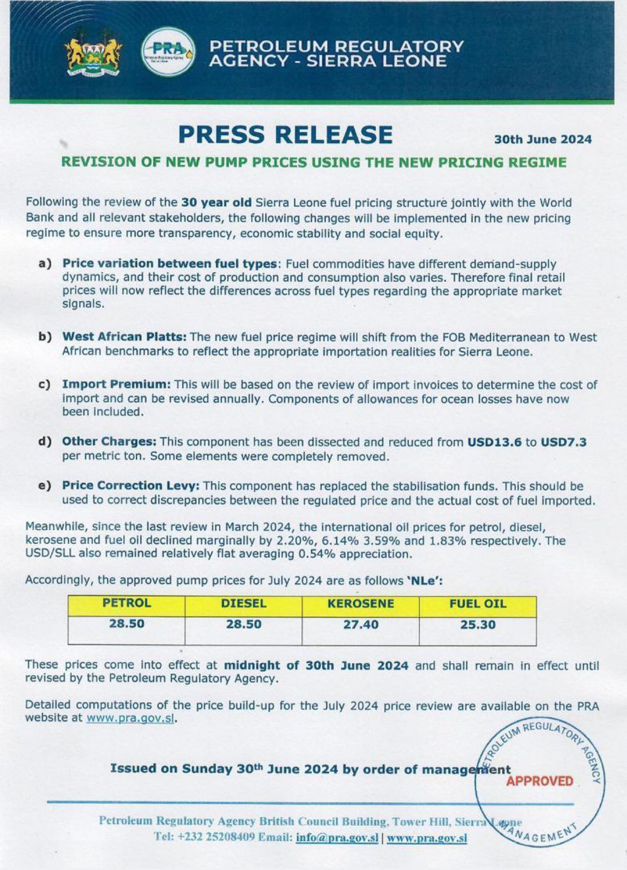 Petroleum Regulatory Agency (PRA) of Sierra Leone has announced a new pricing regime for petroleum products. This development follows an extensive review of the 30-year-old fuel pricing structure, conducted in collaboration with the World Bank and other relevant stakeholders.