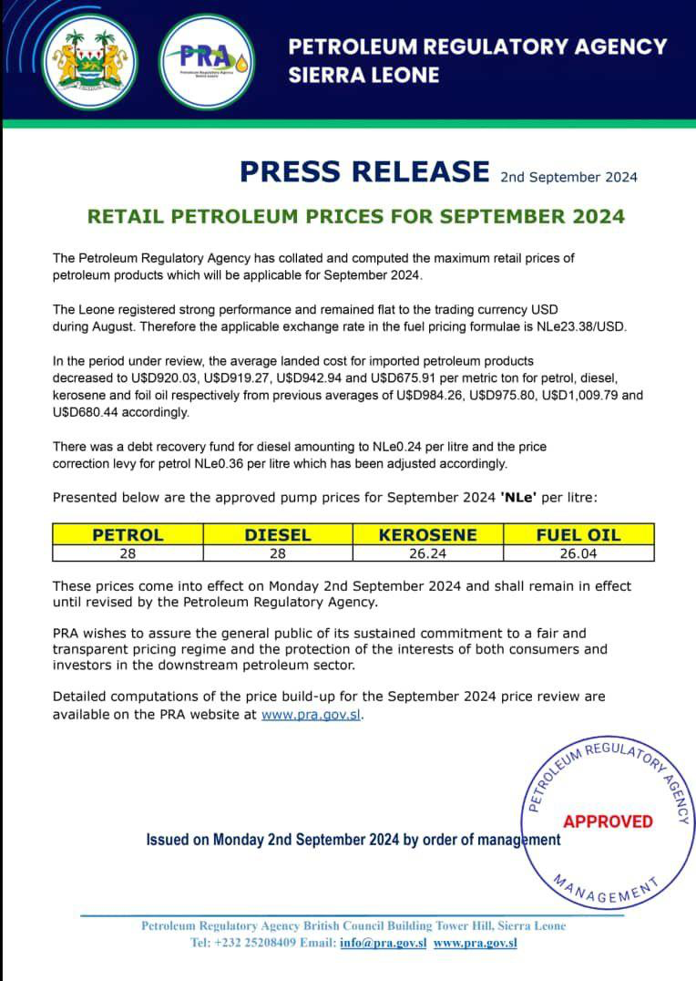 Sierra Leone’s government through the Petroleum Regulatory Agency has announced new fuel prices for September 2024, reducing from NLe 28.50 to NLe 28