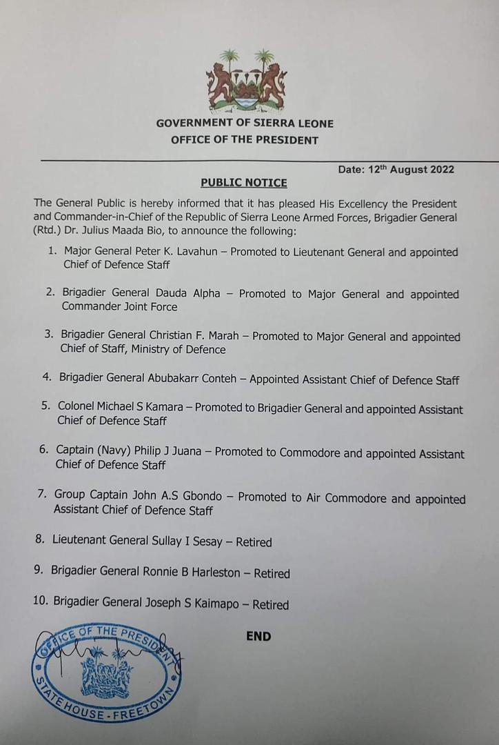 Following his address to nation, President Julius Maada Bio has announced major changes in the leadership of the military. The new chief of Defence Staff is Lt Gen Peter K. Lavahun.