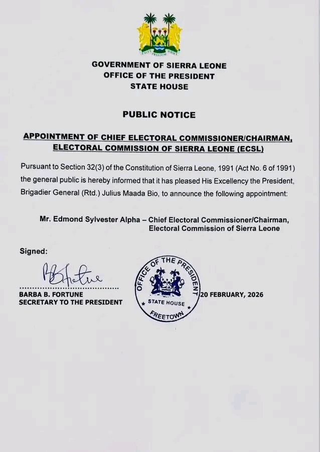 The appointment was announced in a Public Notice issued by the Government of Sierra Leone, Office of the President, State House, on February 20, 2026.