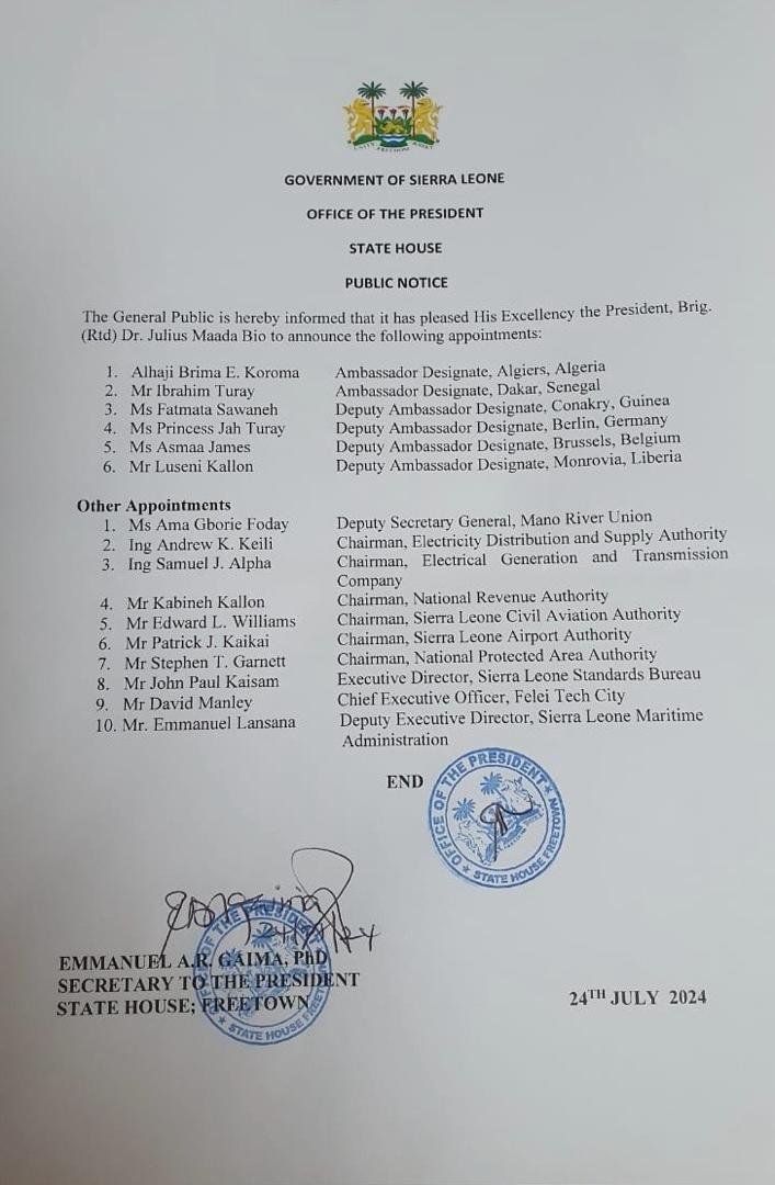 The General Public is hereby informed that it has pleased His Excellency the President, Brig. (Rtd) Dr. Julius Maada Bio to announce the following appointments: