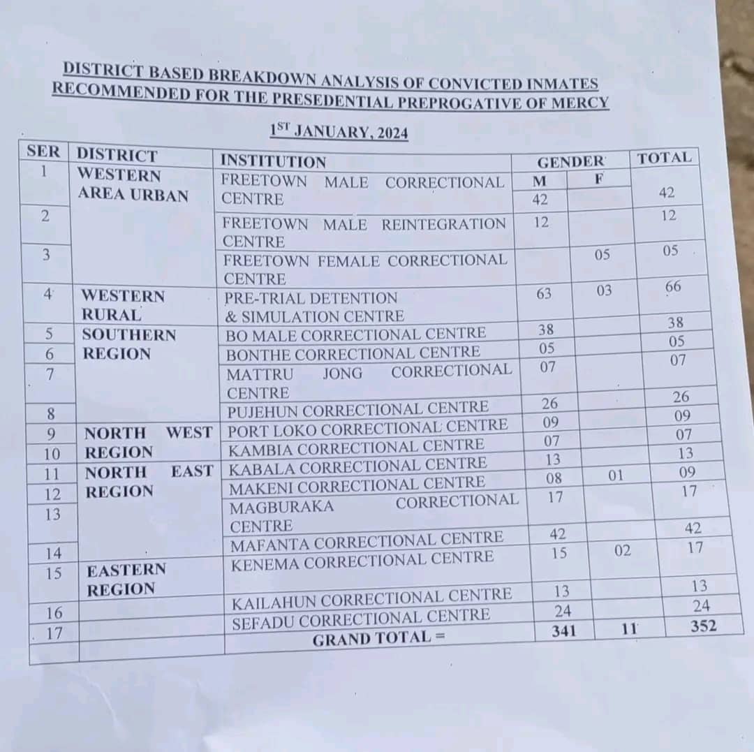 Sierra Leone’s President, Dr. Julius Maada Bio has pardoned three hundred and fifty- two (352) inmates in accordance with Ss 40 (4) (e) and 63 of the 1991 Constitution of Sierra Leone Act No. 6.