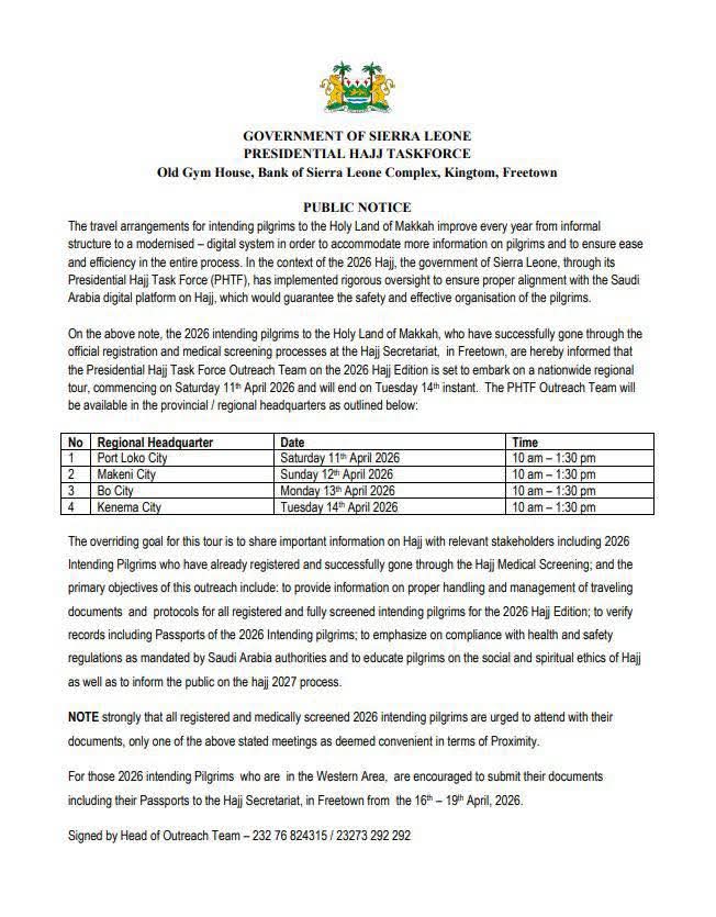 For those residing in the Western Area, the notice clarifies that they are encouraged to submit their documents, including passports, directly to the Hajj Secretariat in Freetown between April 16 and April 19, 2026.