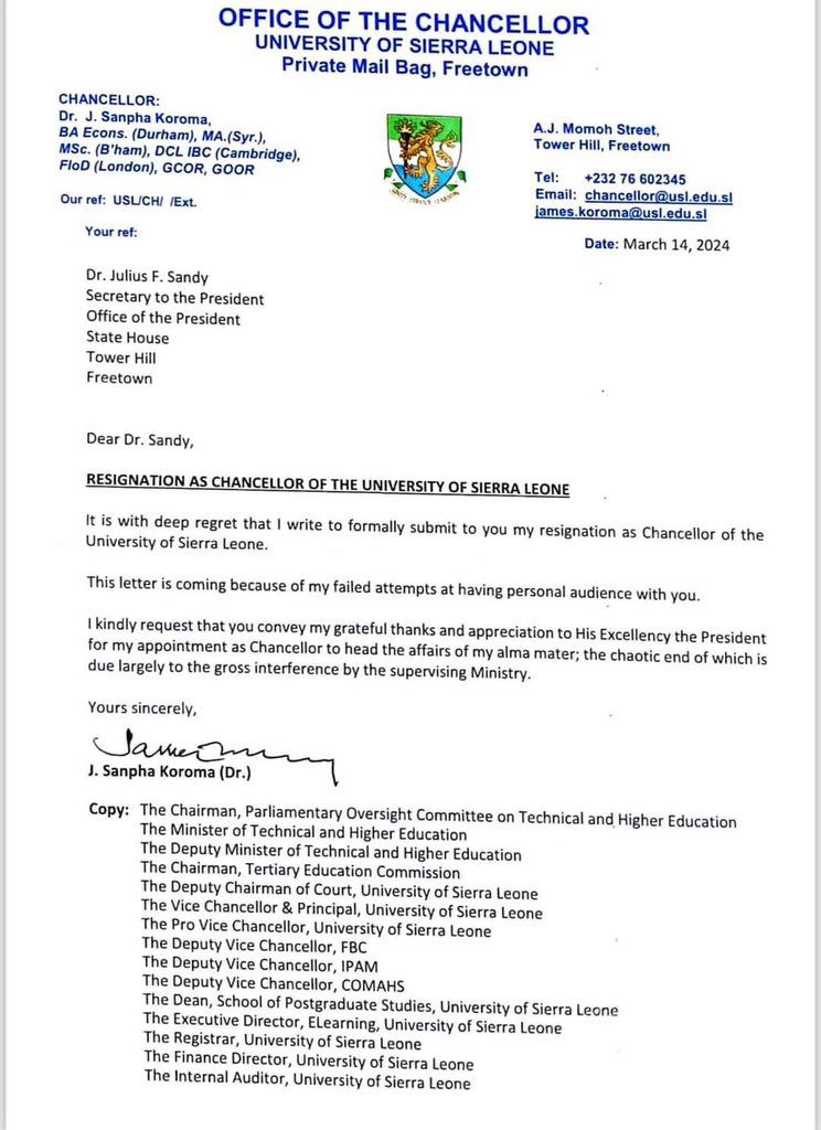 A copy of Dr. Koroma’s resignation letter addressed to the Secretary of the Office of the President expresses his regret: “It is with deep regret that I write to formally submit to you my resignation as Chancellor of the University of Sierra Leone.”