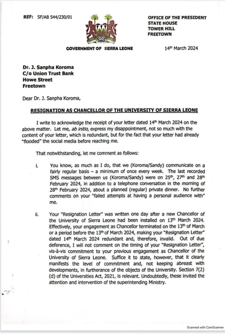“Your “Resignation Letter” was written one day after a new Chancellor of the University of Sierra Leone had been installed on 13th March 2024. Effectively, your engagement as Chancellor terminated on the 13th of March or a period before the 13th of March 2024, making your “Resignation Letter” dated 14th March 2024 redundant and, therefore, invalid.