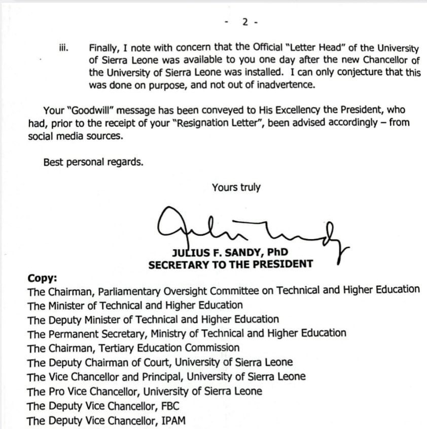 “Out of due deference, I will not comment on the timing of your “Resignation Letter”, vis-à-vis commitment to your previous engagement as Chancellor of the University of Sierra Leone. Suffice it to state, however, that it clearly manifests the level of commitment and, not keeping abreast with developments, in furtherance of the objects of the University. Section 7(2) (d) of the Universities Act, 2021, is relevant. Undoubtedly, these invited the attention and intervention of the superintending Ministry.”