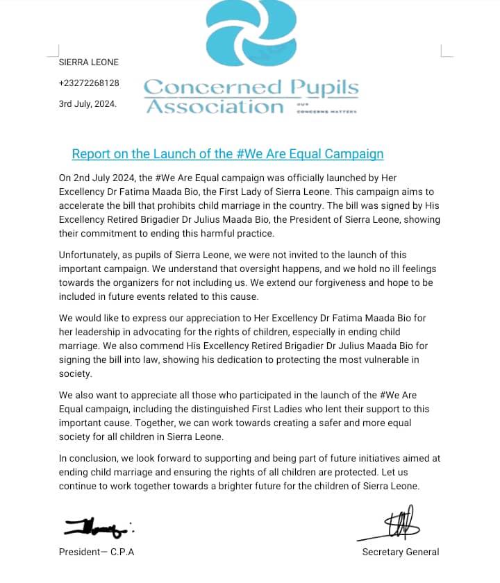 Sierra Leone’s Concerned Pupils Association (CPA) has thrown its weight behind the #We Are Equal Campaign, expressing strong support for its efforts to end child marriage in the country.