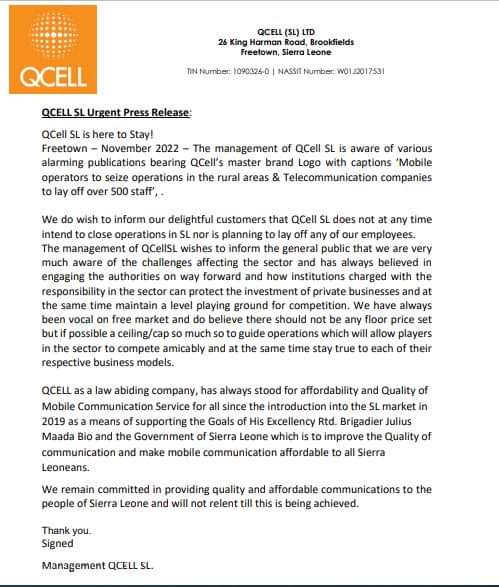 “The management of QCell SL is aware of various alarming publications bearing QCell’s master brand Logo with captions “Mobile operators to seize operations in the rural areas & Telecommunication companies to lay off over 500 staff’, We do wish to inform our delightful customers that QCell SL does not at any time intend to close operations in SL nor is planning to lay off any of our employees.