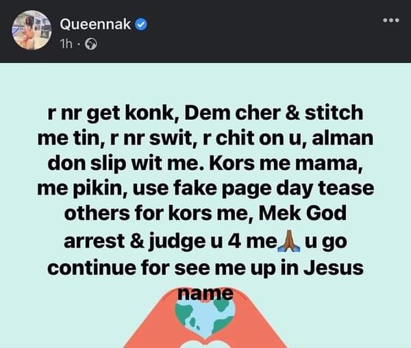 This post of Morris hit Queennak to the extreme that, with dismay and anger, the celebrity used swear words on herself over the allegations. On her post, Queennak claimed that since their separation, Morris has been bashing at her, family, Kid and mother. He has alleged her of sleeping with every man on Earth. She furthered that, Morris had gone to the extreme of creating fake Facebook pages teasing people to throw shots at Queennak, making people believe the messages are from her.
