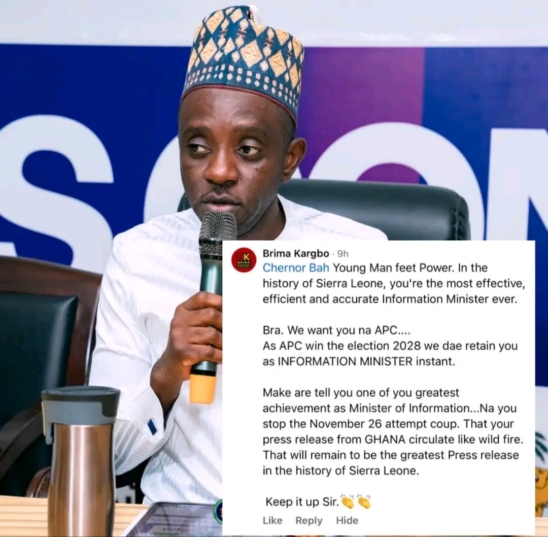 A social media post from Brima Kargbo has drawn attention for its strong praise of Minister of Information and Civic Education, Chernor Bah, and a direct appeal for his future involvement in government under the All People’s Congress (APC).
