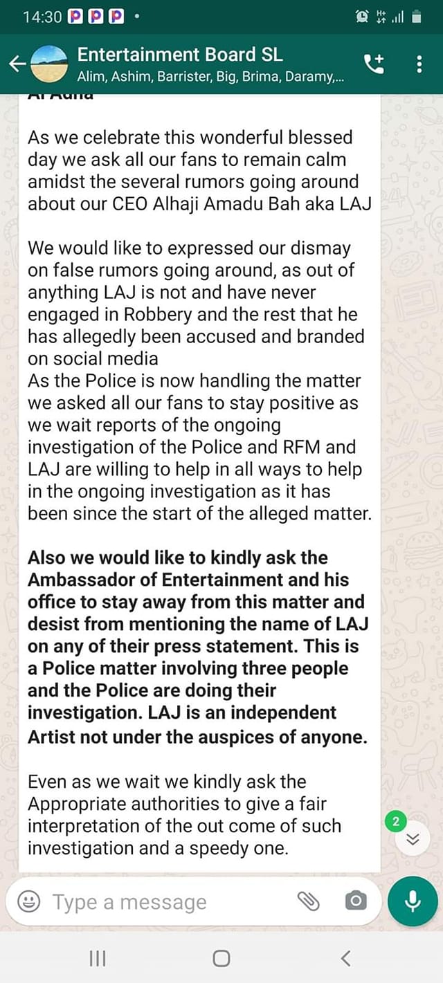 Nevertheless, the management of RFM has asked Ambassador Kao Denero to desist from the case that involved their rapper, Alhaji Amadu Bah popularly known Boss La.
