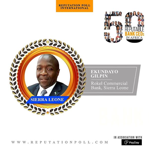 Reputation Poll International LLC, a leading global reputation–management firm, has included the Managing Director of Rokel Commercial Bank among its list of 50 most Reputable Bank CEOs in Africa.