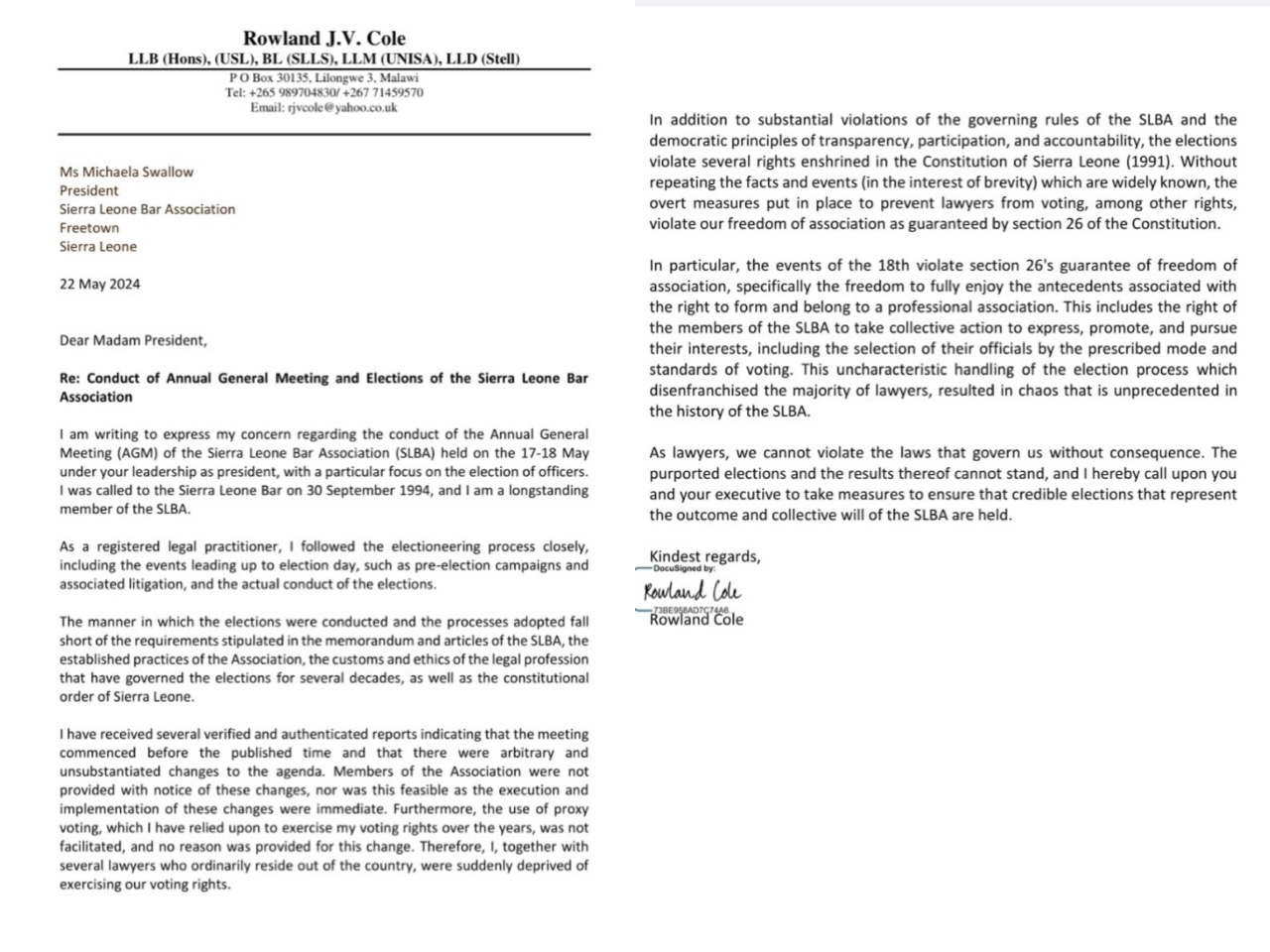 On May 22, 2024, in a formal letter addressed to Ms. Michaela Swallow, President of the Sierra Leone Bar Association (SLBA), Mr. Rowland J.V. Cole, a distinguished legal practitioner and long-standing member of the SLBA, expressed serious concerns regarding the conduct of the Association’s recent Annual General Meeting (AGM) and elections.
