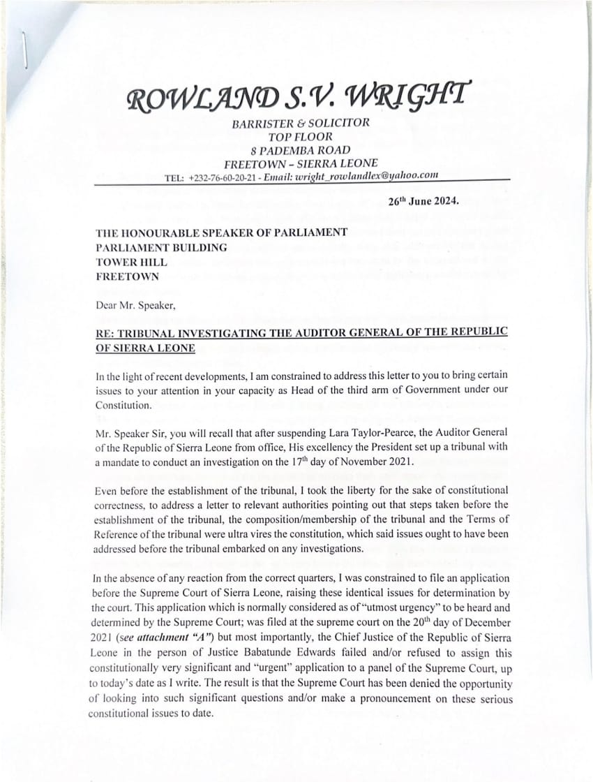 Highly respected lawyer Rowland Wright has called on the Speaker of Parliament, Hon. Segepoh Solomon Thomas, to seek a Supreme Court opinion regarding the tribunal set up by President Bio to investigate suspended Auditor General Lara Taylor-Pearce and her Deputy, Tamba Momoh, for alleged professional misconduct.