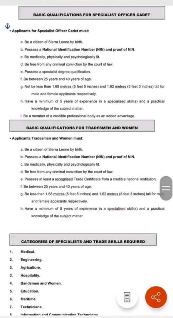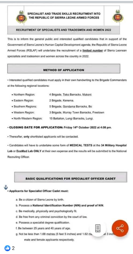 In support of the Government of Sierra Leone’s Human Capital Development agenda, the Republic of Sierra Leone Armed Forces (RSLAF) has released application form and criteria for the recruitment of Specialist & Tradesmen & Women across the country in 2022.