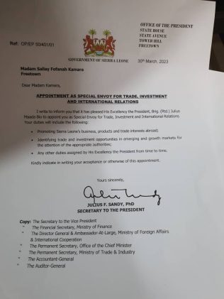 According to the appointment letter, Madam Sallay’s duties as the new Special Envoy for Trade, Investment, and International Relations will include Promoting Sierra Leone’s business, products and trade interests abroad; Identifying trade and investment opportunities in emerging and growth markets for the attention of the appropriate authorities; Any other duties assigned by the President from time to time.