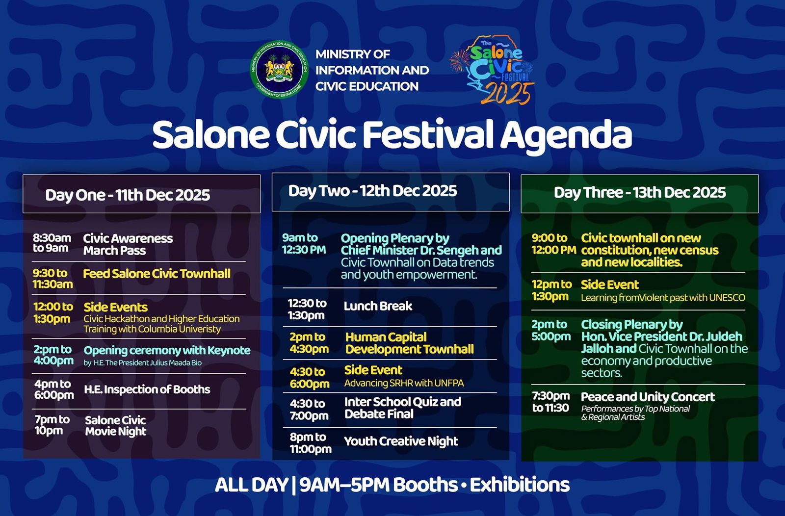 The Ministry of Information and Civic Education has released the full schedule for the 2025 Salone Civic Festival, outlining a three-day program designed to promote civic awareness, national dialogue, youth engagement and cultural expression.