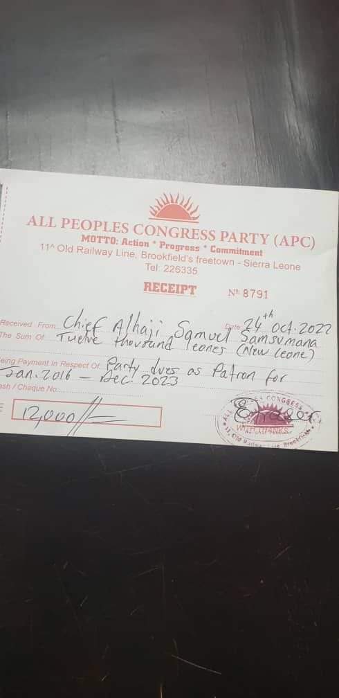 There are photos of receipts circulating on Social Media, showing that the Peace Ambassador has already paid 12000 New Leones as his first dues.