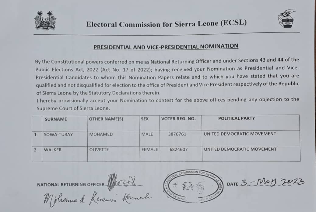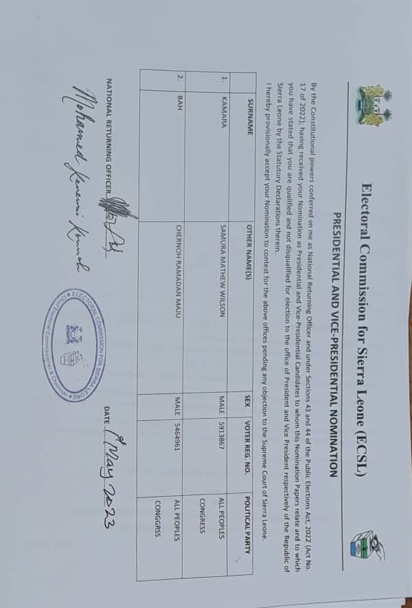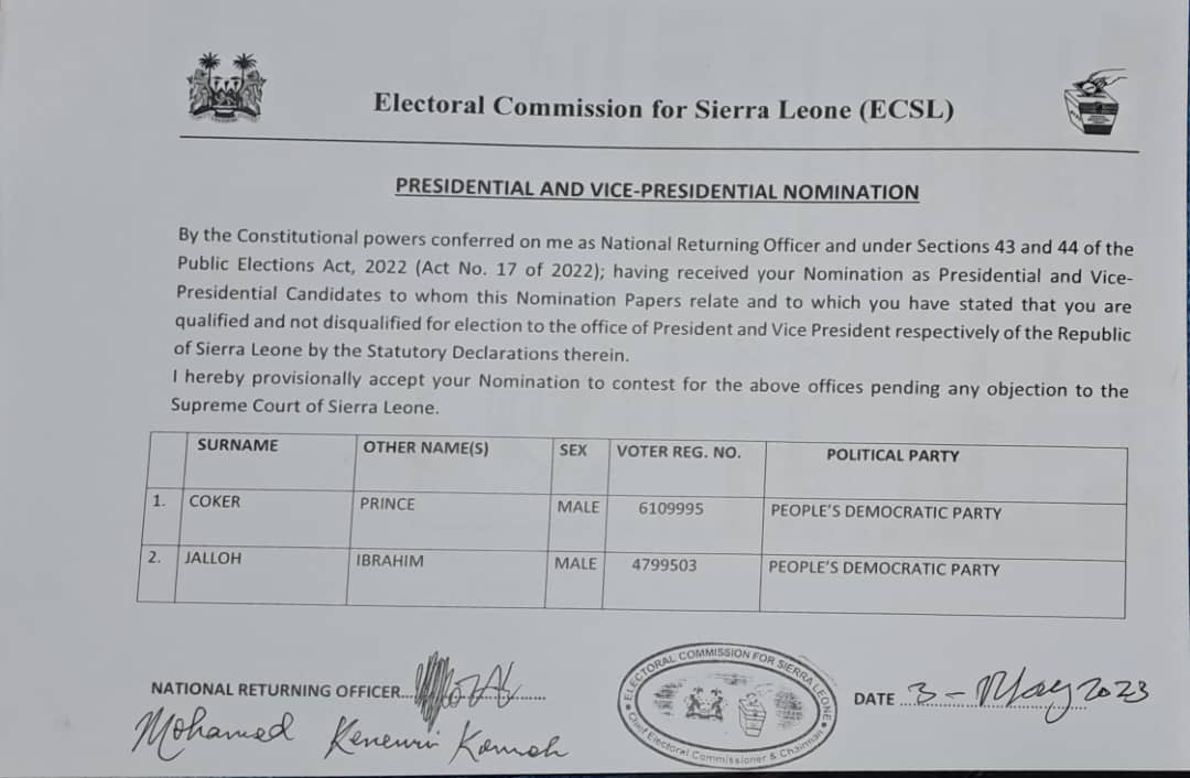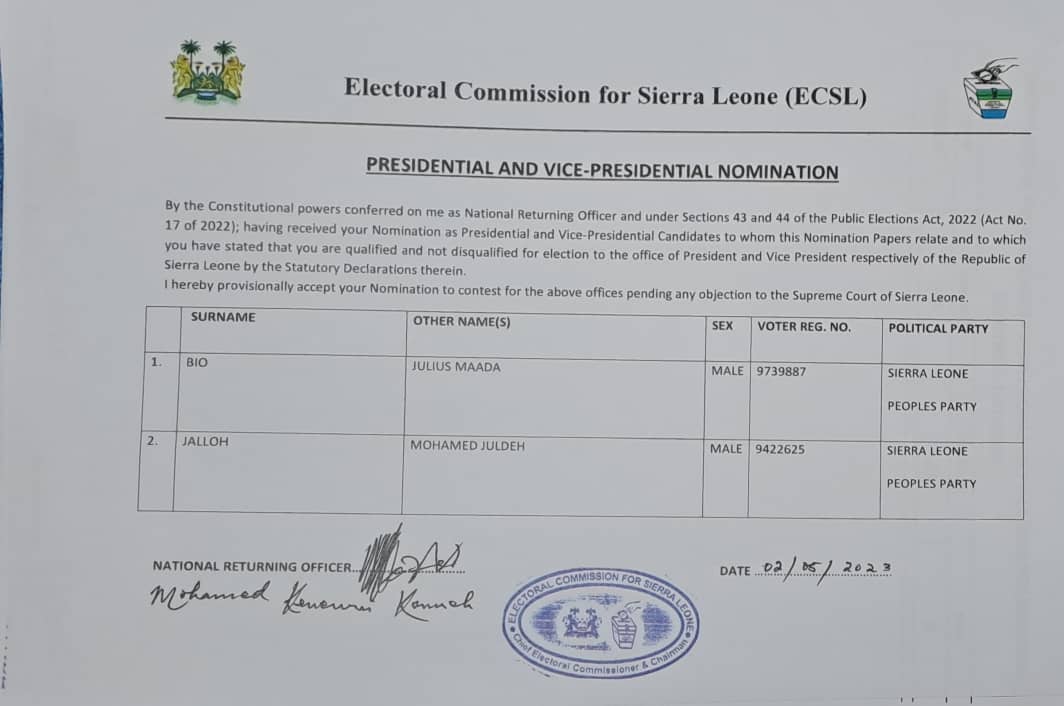 The Electoral Commission of Sierra Leone has announced that all Presidential nominations have been provisionally accepted until May 17, 2023.