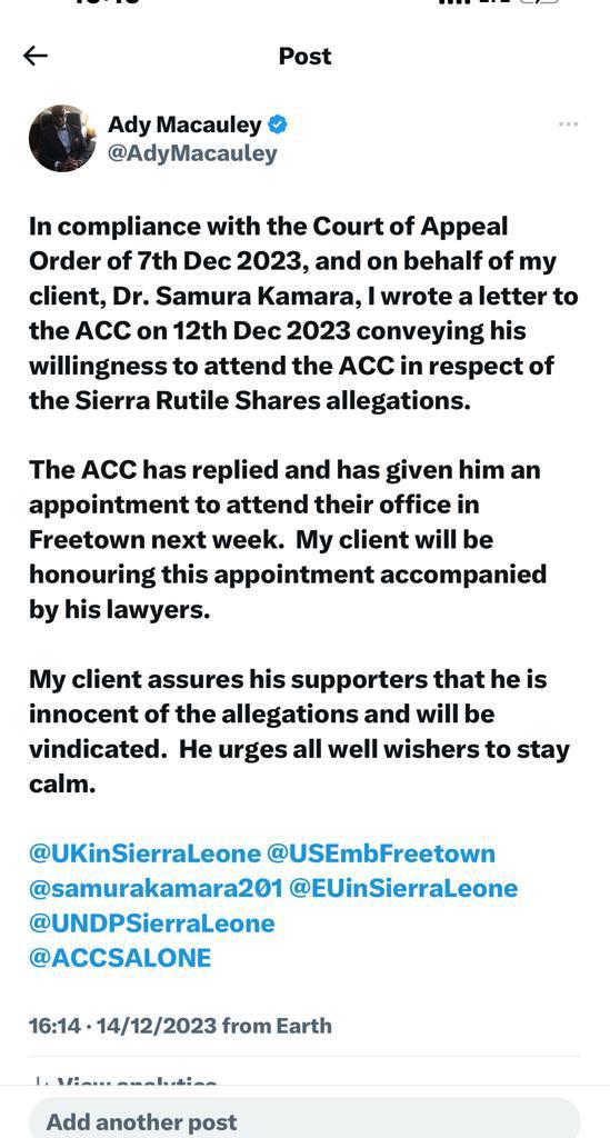 In response to the Appeals Court directive issued on December 7th, 2023, Ordering the leader of the main opposition, Dr. Samura Kamara, to appear before the Anti-Corruption Commission (ACC) concerning suspected corruption linked to the sale of government shares in Sierra Rutile, his legal representative, Ady Macauley, has taken action.