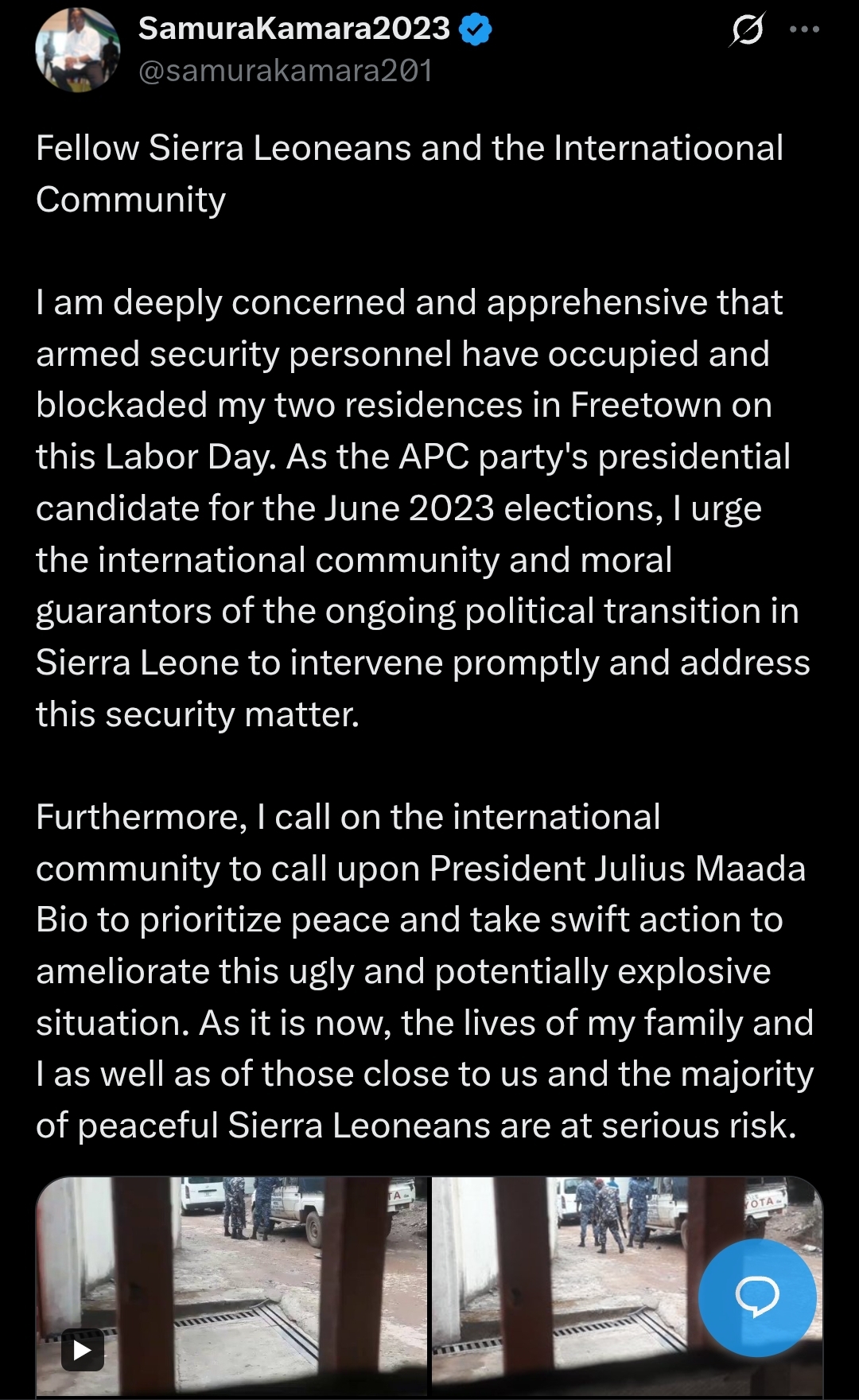 “I am deeply concerned and apprehensive that armed security personnel have occupied and blockaded my two residences in Freetown on this Labor Day,” Kamara wrote. “As the APC party’s presidential candidate for the June 2023 elections, I urge the international community and moral guarantors of the ongoing political transition in Sierra Leone to intervene promptly and address this security matter.”