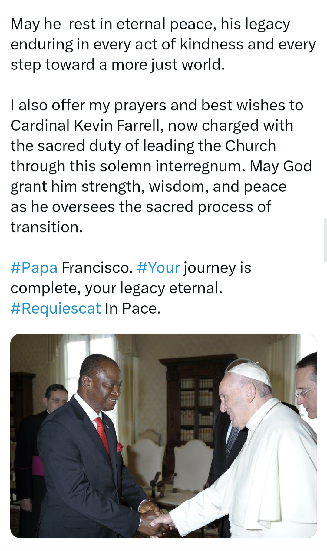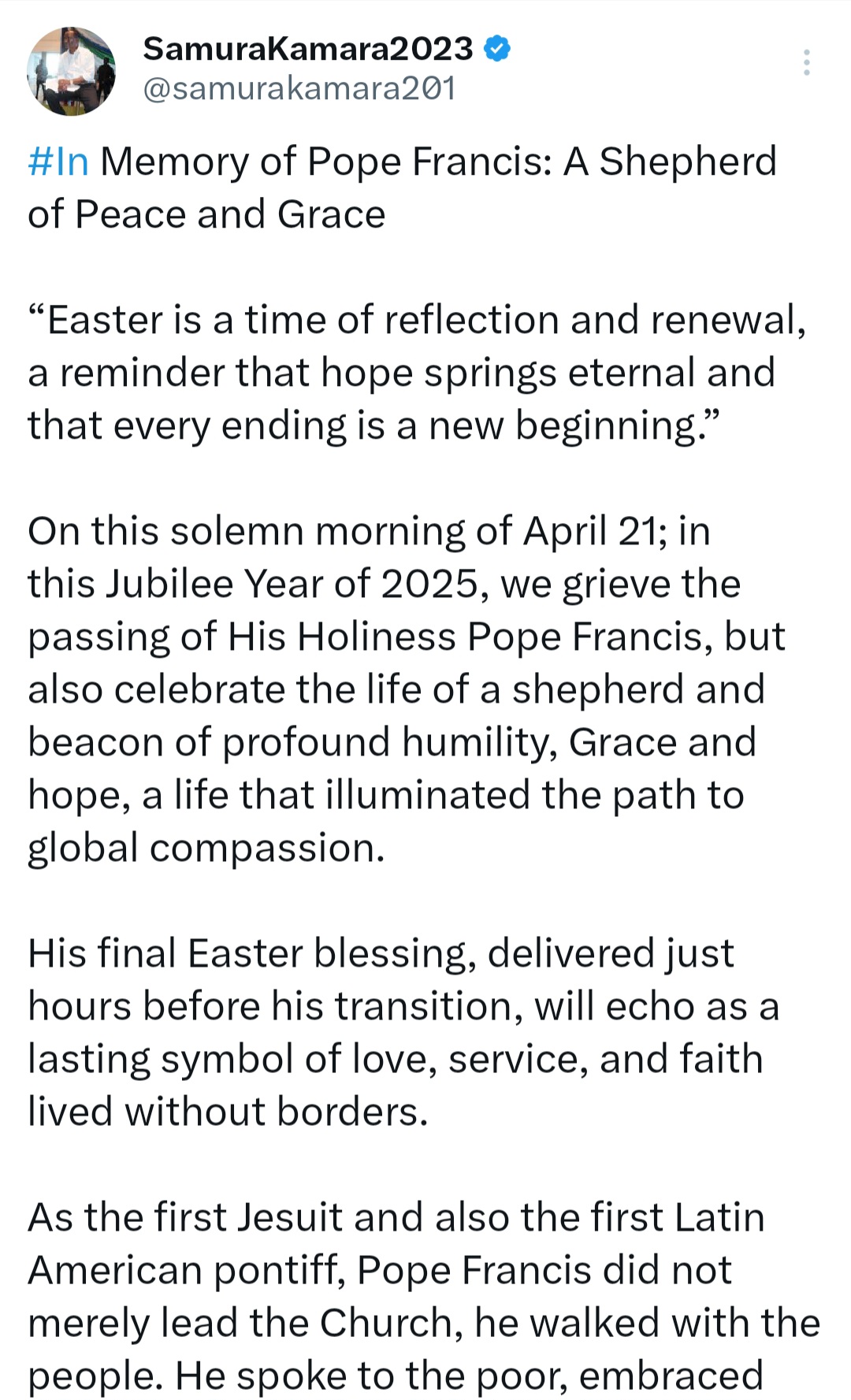 Dr. Samura Mathew Wilson Kamara, a prominent member of Sierra Leone’s main opposition party, the All People’s Congress (APC), has joined world leaders in mourning the death of Pope Francis.