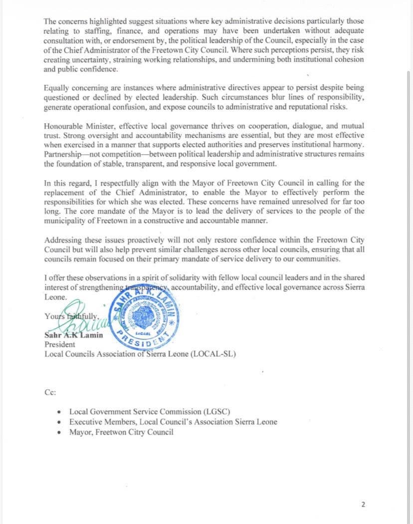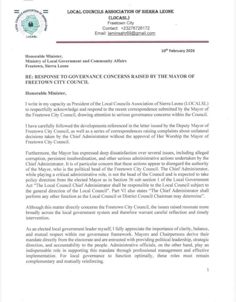 In a formal letter dated February 10, 2026, and addressed to the Minister of Local Government and Community Affairs, the President of LOCASL, Sahr A.K. Lamin, said the Association had carefully reviewed complaints raised by Mayor Aki-Sawyerr regarding the conduct of the Chief Administrator and the overall governance situation within the Council.